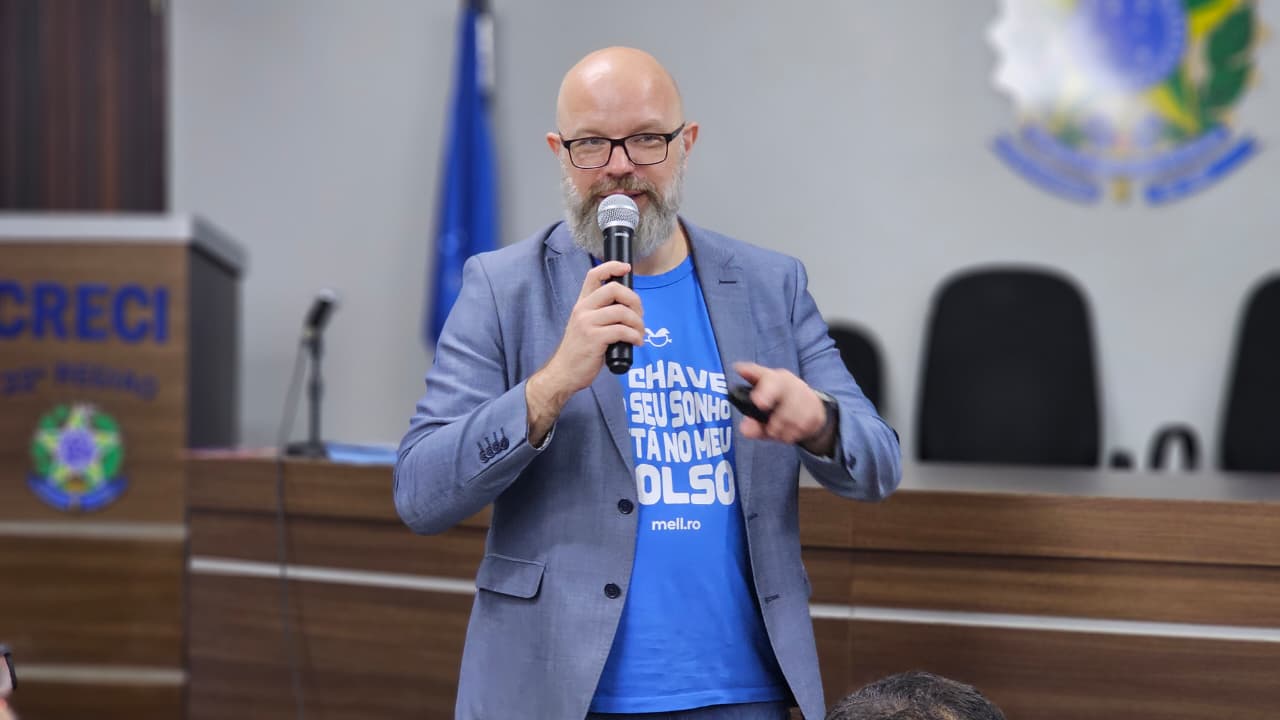 O palestrante foi Osni Passos, founder & CEO da Mell.ro, uma plataforma que digitaliza gratuitamente corretores de imóveis e imobiliárias, oferecendo soluções como garantia de aluguel e antecipação de aluguéis e comissões.